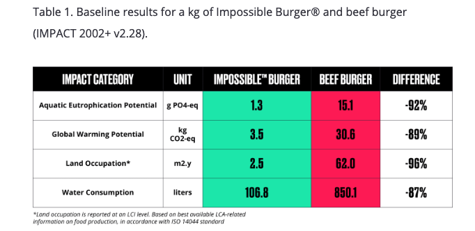 One of the key selling points from Impossible Foods is that its product is better for the planet. Its website claims, when compared to an equivalent beef burger, an Impossible Burger uses 87% less water, 96% less land, 89% fewer greenhouse-gas-emissions, and 92% fewer aquatic pollutants. Most of these reductions come from the “raw material production stage” according to Impossible Foods. These are pretty remarkable claims, and you can read them in the study commissioned by Impossible Foods on its website.